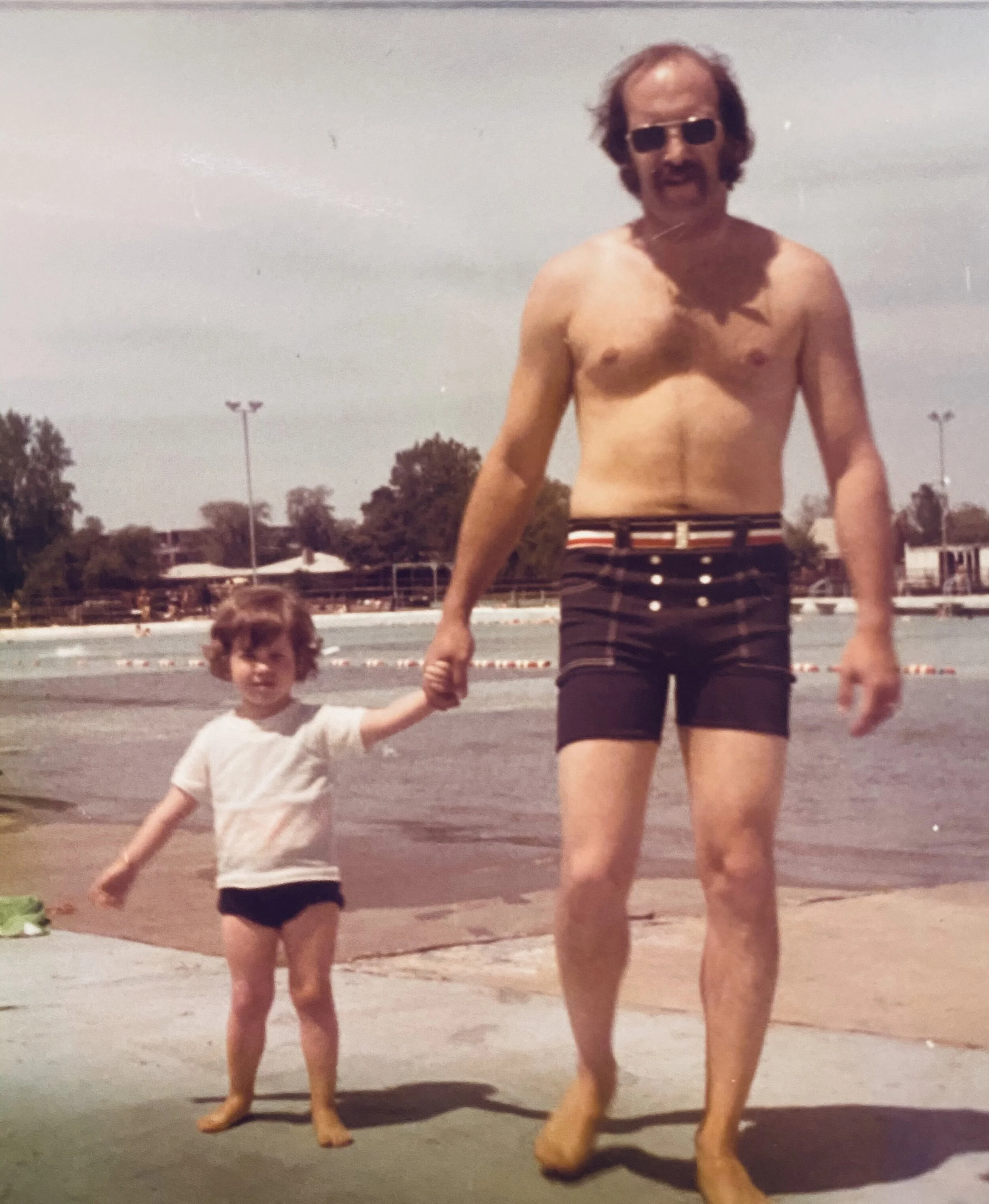 Pushing my cart, I feel my heart beating in my chest, and I see him, standing at the mustard-yellow stove, a short guy with a bald head and a mustache, a lit cigarette within reach. He’s attentive, relaxed, sniffing every now and then, and I wonder where I am in the picture. I stop in front of the untouched display of Wonder Bread, which he loaded with sauteed onions, butter, celery, salt and dried sage. I see myself, a skinny girl of 8, standing a few feet behind her dad on the linoleum floor, wanting to love him.